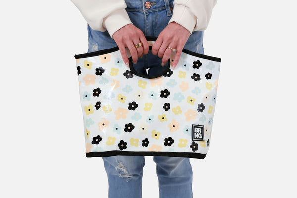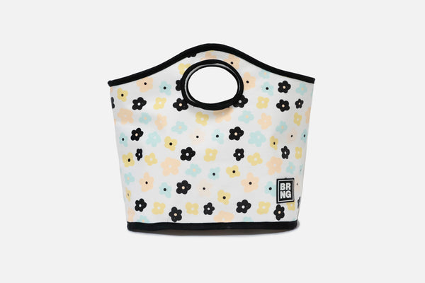 With cottagecore charm and a retro-chic vibe, our Chantel mini tote is so much fun featuring a scattering of daisies in soft baby shades (with a few black ones thrown in for a little drama) and just enough room for your most go-to essentials.