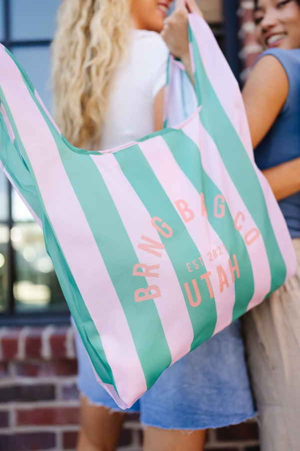 Step into style with our pink and green striped Anita BRNG bag, a playful twist on a classic tote. This reusable bag is designed to be your biggest bag yet, with ample space for groceries, books, or whatever you need to carry. Whether you're running errands or meeting up with friends, this little tote bag is the perfect companion. Plus, it's reusable and eco-friendly, making it a great alternative to single-use bags. Get ready to fall in love with this striped cutie and make it your new favorite reusable bag