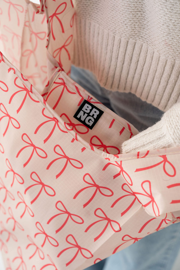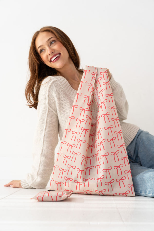 The Albion Daily bag brings festive charm to your seasonal wardrobe with its elegant ivory and striking red bow accents. Perfect for holiday gatherings and winter celebrations, this versatile carryall combines timeless sophistication with playful holiday spirit.